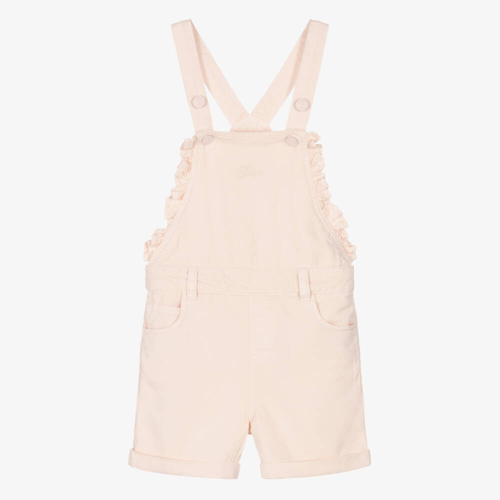 Pale pink dungaree shorts for girls by Guess. They are made in a super-soft and lightweight twill weave, with eco-friendly and gentle-on-the-skin Tencel fibres. Fastening with logo-embossed buttons, they have adjustable shoulder straps for a good fit. The bib is trimmed with frills and the waist is elasticated for comfort. Tone-on-tone branding is embroidered on the front bib and the iconic metal triangle logo can found on the back pocket to complete the design.