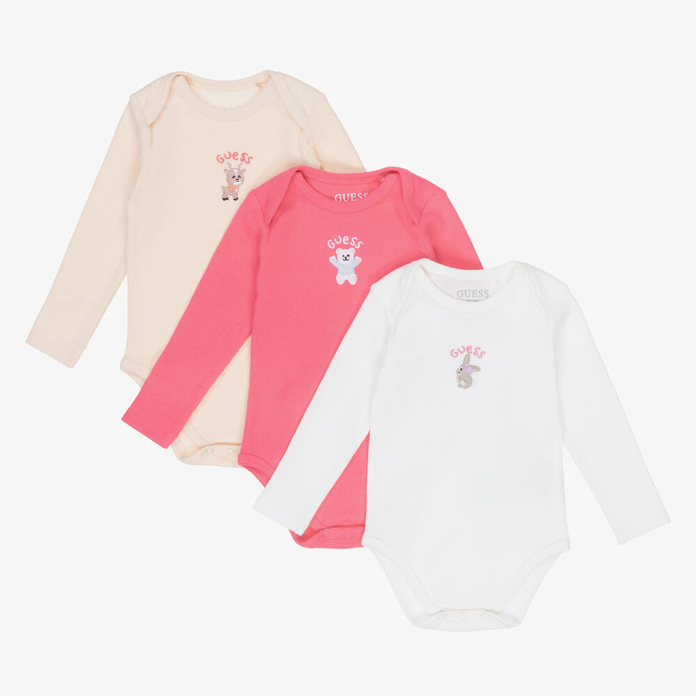 Pack of three cotton bodyvests for baby girls by Guess, in shades of pink, beige and white. Made from soft, ribbed jersey, each vest has an adorable animal appliqué and embroidered logo on the front. They are designed with envelope necklines and have poppers between the legs for easy dressing.