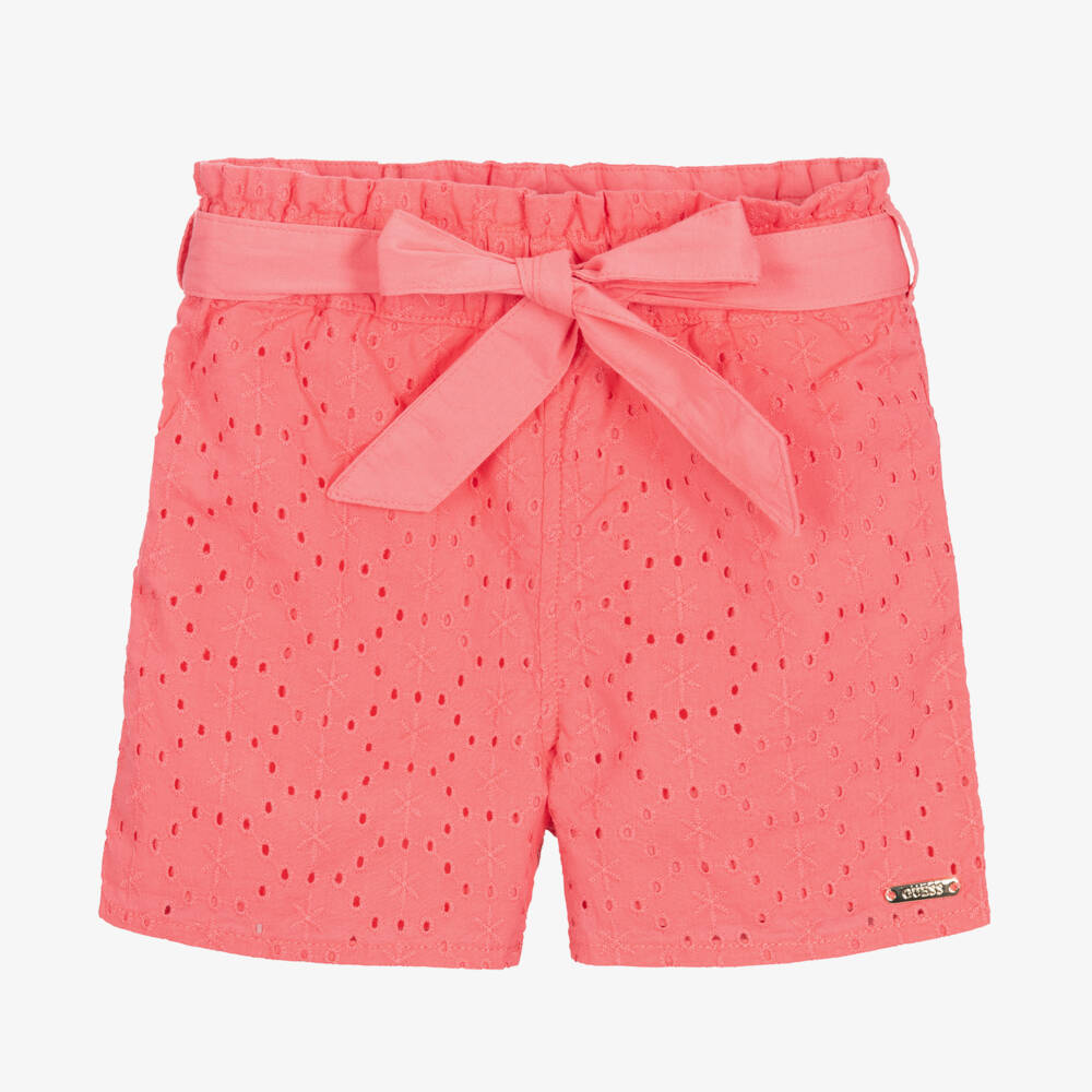 Pretty pink cotton shorts for girls by Guess. Made in broderie anglaise with a comfortable lining, this easy-to-wear style has an elasticated waist with a removable fabric tie. To complete the look, the designer's metal logo plate can be found on one leg.
