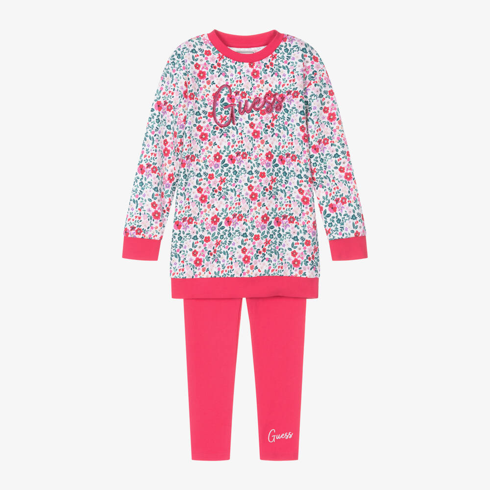 Girls pink and white dress and leggings set by Guess, made in soft and stretchy cotton jersey. The white sweatshirt dress is patterned with a pretty pink and green floral print, with fuchsia pink ribbed trims and a dark pink embroidered and sequin logo on the front. The plain fuchsia pink leggings have a comfortable elasticated waistband and a silver embroidered logo on one leg for a statement designer finish.