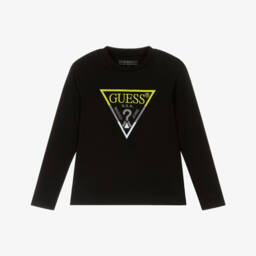 Pink long-sleeved top for younger girls by Guess, made in soft cotton jersey. Combining classic comfort with a touch of sparkle, it has the brand's iconic Triangle logo embroidered on the front in pastel shades of blue, pink and yellow with glittery sequin detailing.