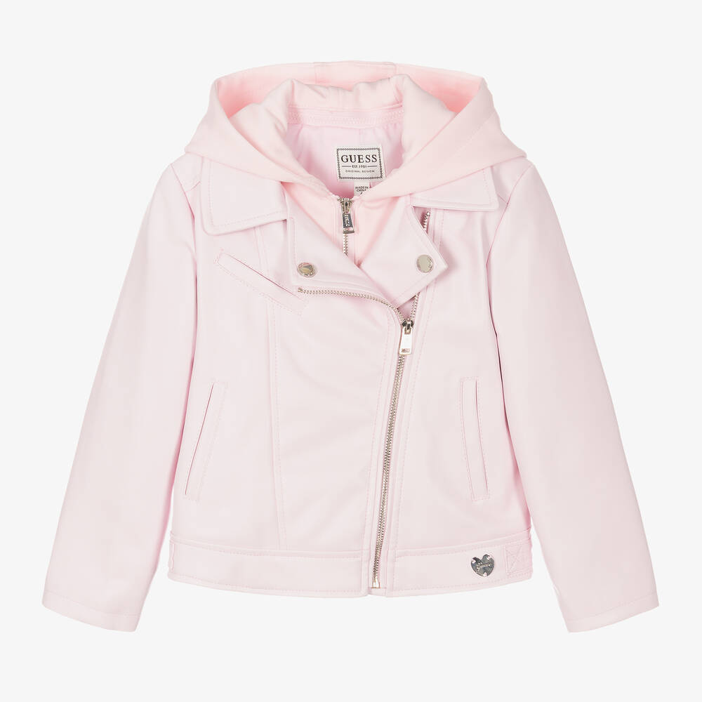 A pink faux leather jacket for girls by Guess, with side pockets and a silky lining. A double-layered look, this cool biker jacket has a removable, zip-on hood panel made in soft jersey. The jacket has edgy silver-hued hardware, a heart-shaped logo charm on the hem, and branded faux poppers on the lapels. Both the jacket and hood panel fasten easily with front zips.