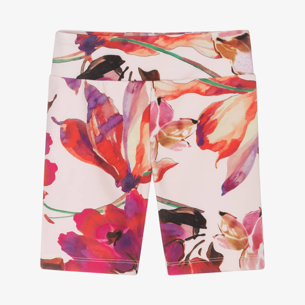 Lovely pastel pink cycling shorts for girls by Guess, made in stretchy sports lycra. Patterned with a pretty pink floral print all-over, they have a comfortable stretchy waist and a white logo print on the back for branded finish. This item contains recycled plastic.