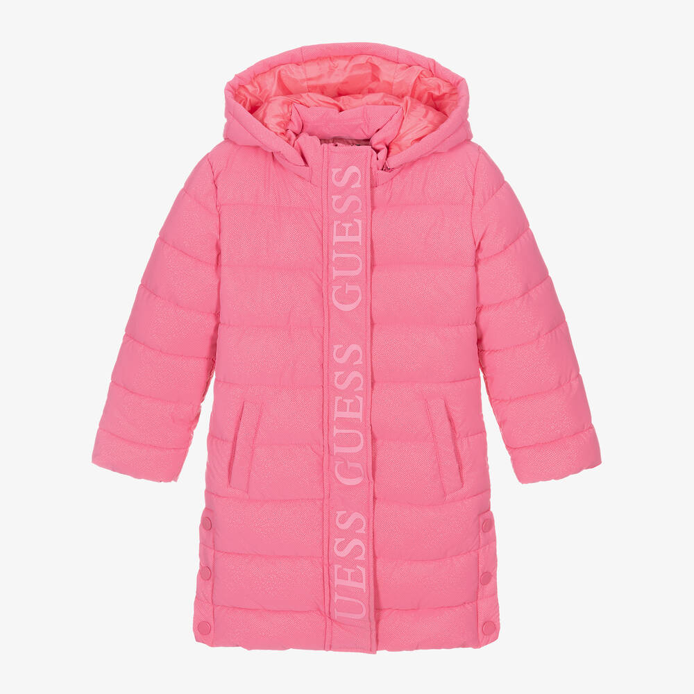 Warmly padded, a bright pink puffer coat for girls by Guess, with a tint, tonal dot pattern and a detachable, zip-on hood for extra cosiness. The front placket has repeat, rubberised logos running down it, with popper fastenings and a zip below. There are front pockets and poppers on the sides to allow extra space for ease of movement.