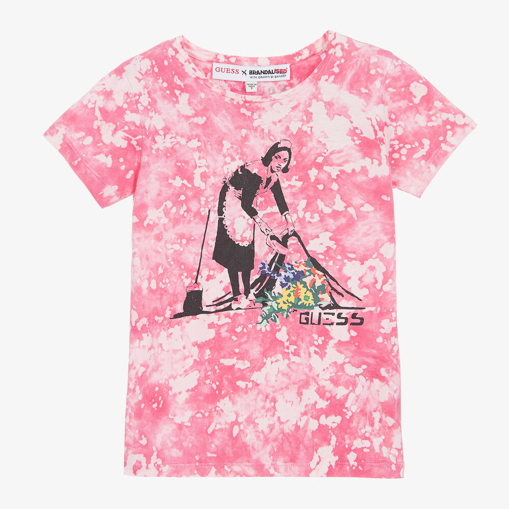 Cool pink tie-dye T-shirt for girls by Guess, made in soft cotton jersey for comfort. Forming part of the designer's Brandalised capsule, it has a cool artwork printed on the front from the iconic British street artist, Banksy. This item contains organic cotton fibres.