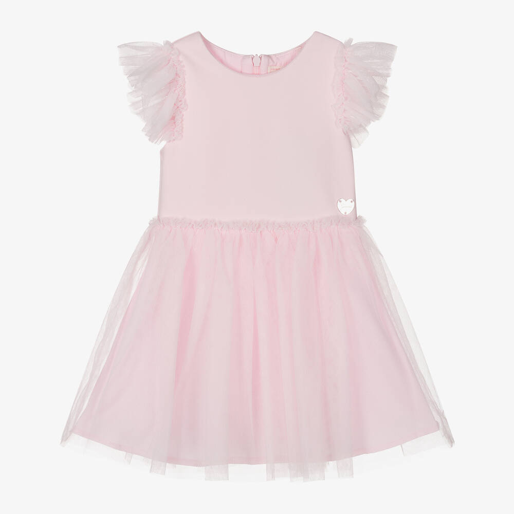Pretty pink dress for little girls by Guess. The bodice is made in soft viscose blend jersey with a silver heart-shaped logo charm at the waist. The skirt is made layers of soft tulle, with matching tulle trims around the armholes. The dress has a double layer lining of lightweight viscose for comfort and fastens with a concealed zip on the back. A pair of matching knickers add a lovely finishing touch.