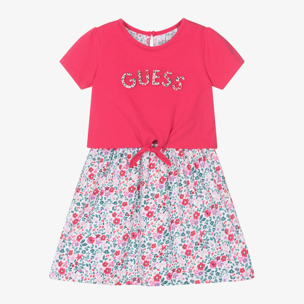 White dress for younger girls by Guess, made in soft and stretchy cotton jersey, with a pretty pink and green floral pattern. The bodice has a contrast fucshia pink overlay with a co-ordinating floral-patterned, raised logo on the front and a stylish keyhole tie. This casual dress has a single button fastening on the back.