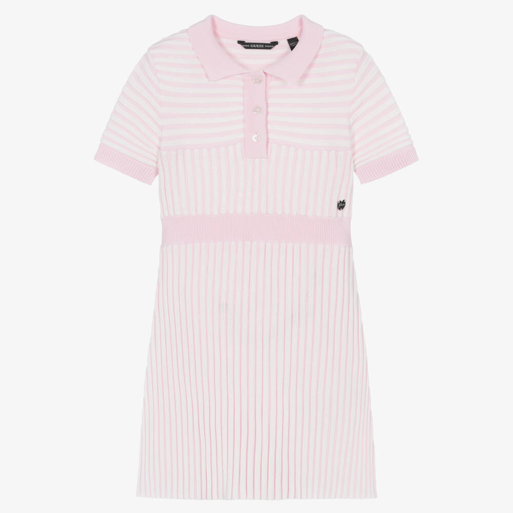 Pink and white striped dress for girls by American brand Guess, made from a stretchy, mid-weight viscose blend. A comfortable polo style, this casual dress has a pink collared neckline with branded button fastenings and horizontal stripes on the bodice. There is a heart-shaped, metal logo charm sewn on the waistline for a subtle designer detail.