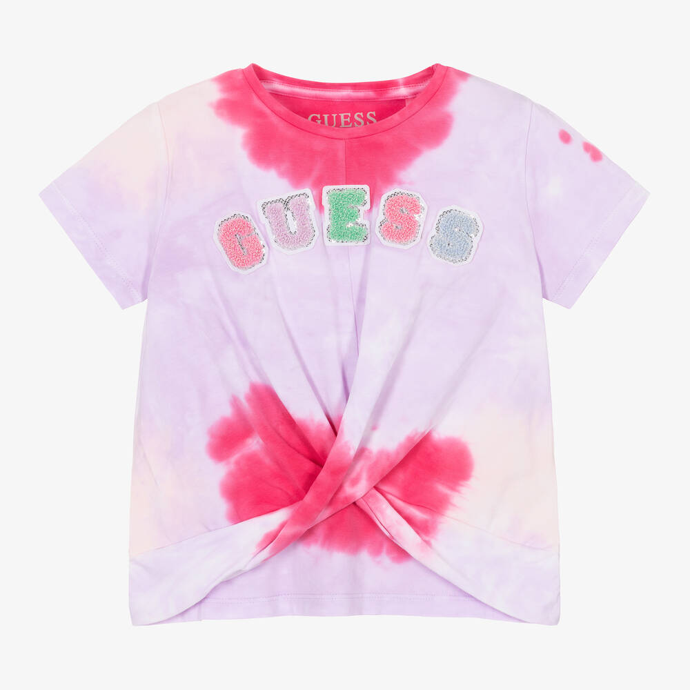 A lilac purple and pink tie-dye T-shirt for girls by Guess, made from super soft cotton jersey. Offering a pretty yet casual look, this tee has a looped sequin logo design on the front, with a wrap-over effect hem for added shape.