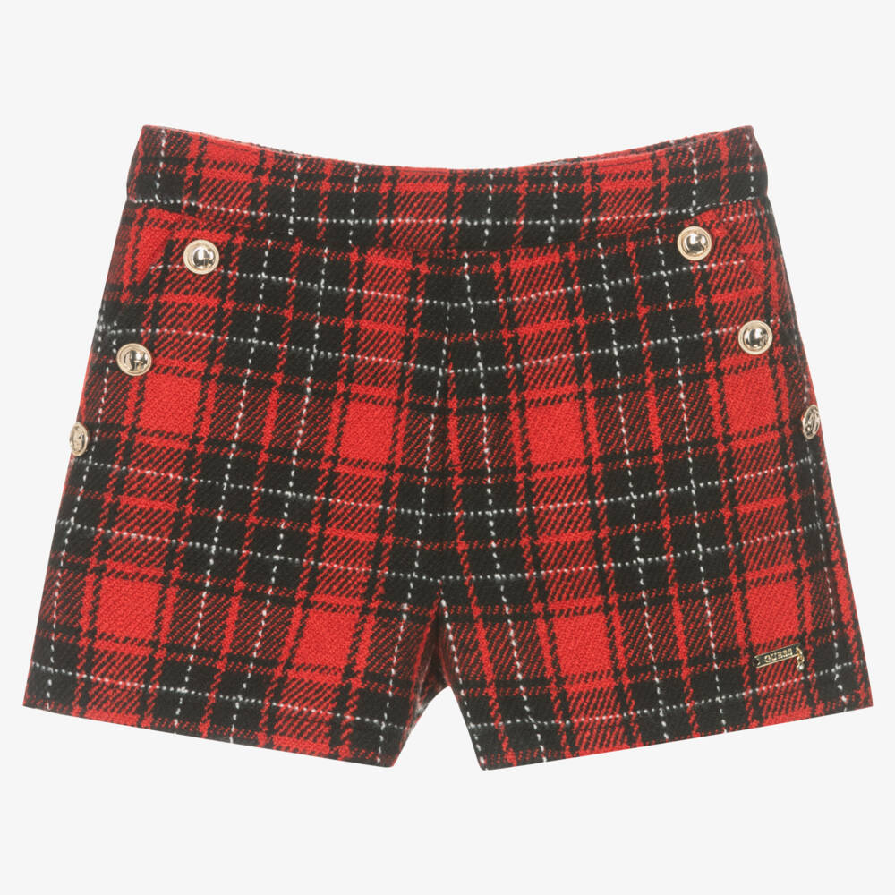 Girls red and black smart tartan shorts designed by Guess. Soft and mid-weight, these shorts have stylish side pockets with gold, branded buttons. There is a concealed zip fastening on the back and a useful adjustable waist which can be altered as your child grows.