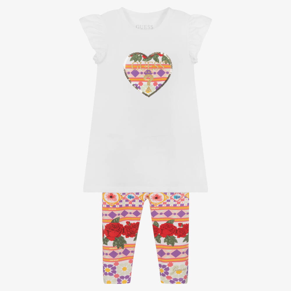 Eye-catching T-shirt and leggings set for girls by American brand Guess, made in soft and stretchy cotton jersey. The comfortable leggings have a vibrant geometric pattern, incorporating roses and subtle logos in red, pink, purple and yellow. The white tunic T-shirt has pretty flutter sleeves and a heart logo design with glittery gold print, shiny sequins and a pattern to match the leggings for a beautifully coordinated look.