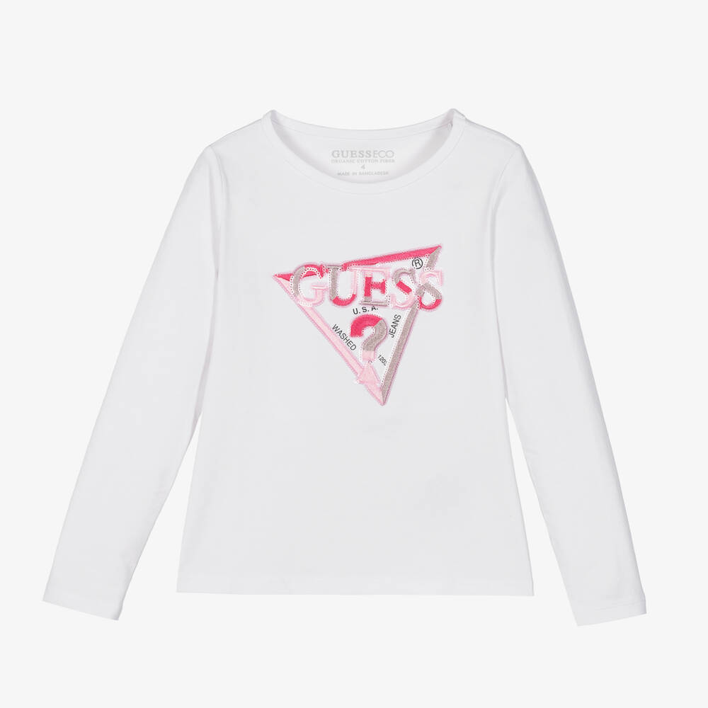 Pretty white long-sleeved top for girls from American brand Guess, made in soft and comfortable organic cotton jersey. The front is embroidered with the brand's instantly recognisable Triangle logo, with sequins giving it a sparkling finish.