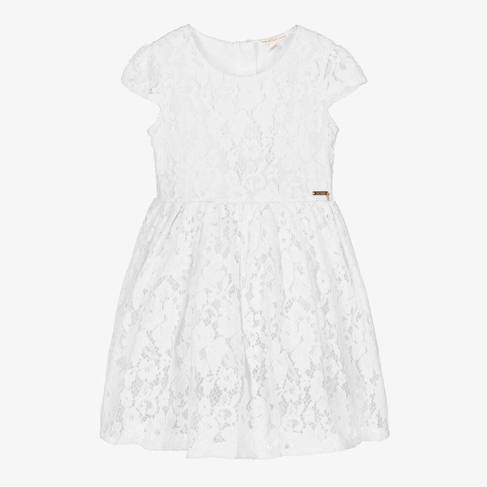White dress for girls from American brand Guess. This gorgeous design is made in intricate, luxurious floral lace, and detailed with a golden logo plate on the waist. The capped sleeves and stiff tulle underlayer give this lovely dress a feminine silhouette. Fully lined with comfortable cotton voile, it fastens easily with a neat hidden zip on the back.