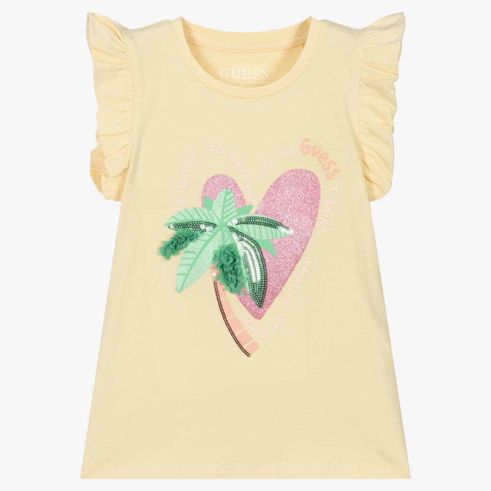 Adorable pale yellow T-shirt for girls by Guess, crafted from a soft organic cotton jersey. It has a glittery heart and palm tree motif which is finished with sequin and 3D appliqué detailing. It has ruffle trim sleeves for a sweet and feminine finish.