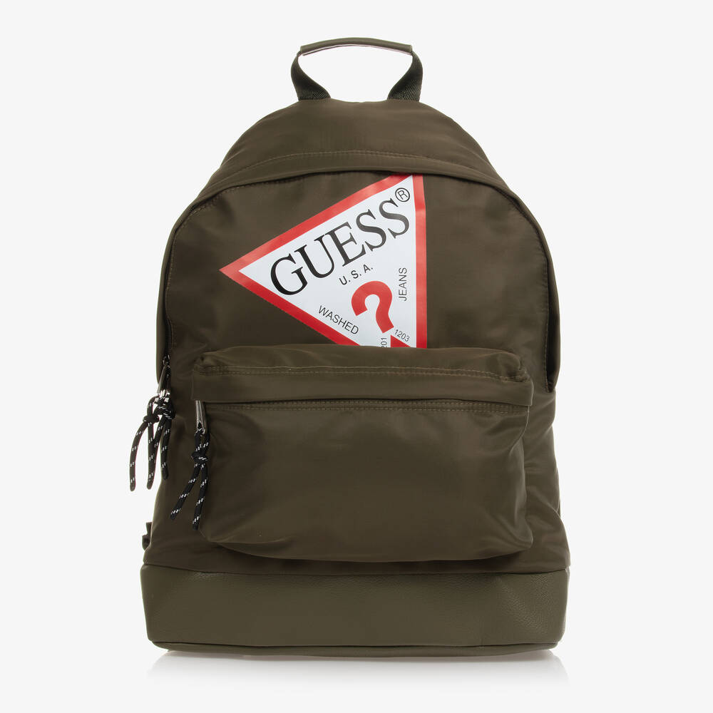 Stylish khaki green backpack for boys and girls by Guess, made in a smooth, silky fabric with grained faux leather trims. Fastening with a zip, the spacious main compartment has a secure zip-up internal pocket, ideal for storing smaller essentials. There is a further external compartment on the front, with the brand's red, white and black Triangle logo printed above. Both the back of the bag and the adjustable shoulder straps are padded for comfort and there is a useful carry handle on the top.