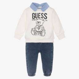 Ivory tracksuit set by Guess is a charming and cosy choice for baby boys and girls. The set includes a long-sleeved bodysuit with a playful teddy bear and logo print, adding a touch of fun. The hooded top features little bear ears on the hood, and the coordinating joggers have an elasticated waist for comfort.