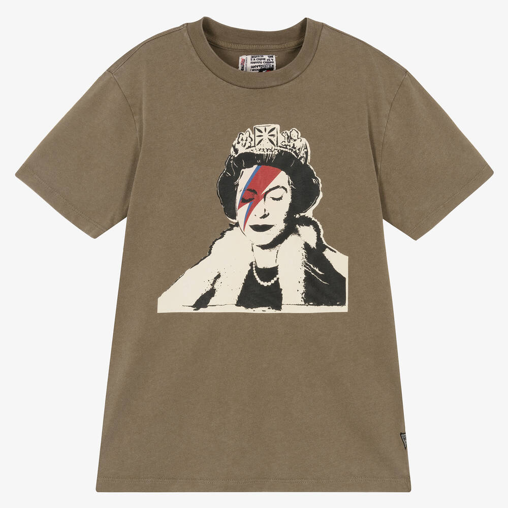A green T-shirt for junior boys from American brand Guess, made in soft cotton jersey. Forming part of the designer's Brandalised capsule, it has an iconic artwork piece from graffiti artist Banksy on the front. Cool and casual, with a traditionally cut crew neck and short sleeves it is an ideal addition to a designer T-shirt collection.