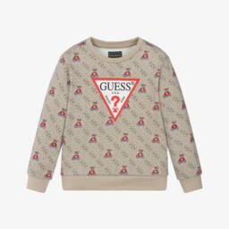 Bold green sweatshirt for junior boys by American brand Guess, with a camouflage pattern. Made in comfortable, mid-weight cotton jersey, this casual top has a crew neck and ribbed trims. For a standout finish, the iconic Triangle logo is printed on the chest in orange and white.