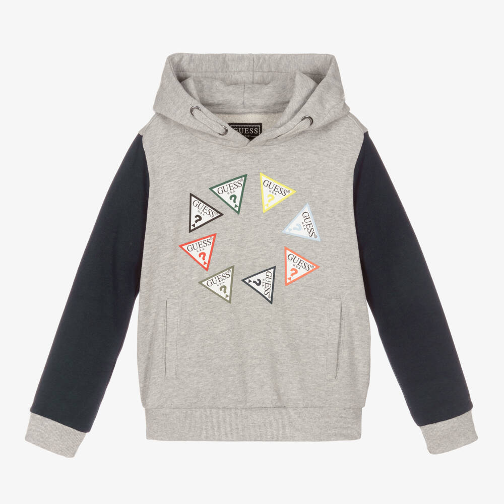 Grey marl and navy blue hoodie for junior boys from Guess. Made in stretchy, mid-weight cotton-rich jersey, this cool piece features the designer's colourful Triangle logo graphics and handy pockets on the front. The hood has a faux drawstring detail and is lined with jersey for extra comfort.