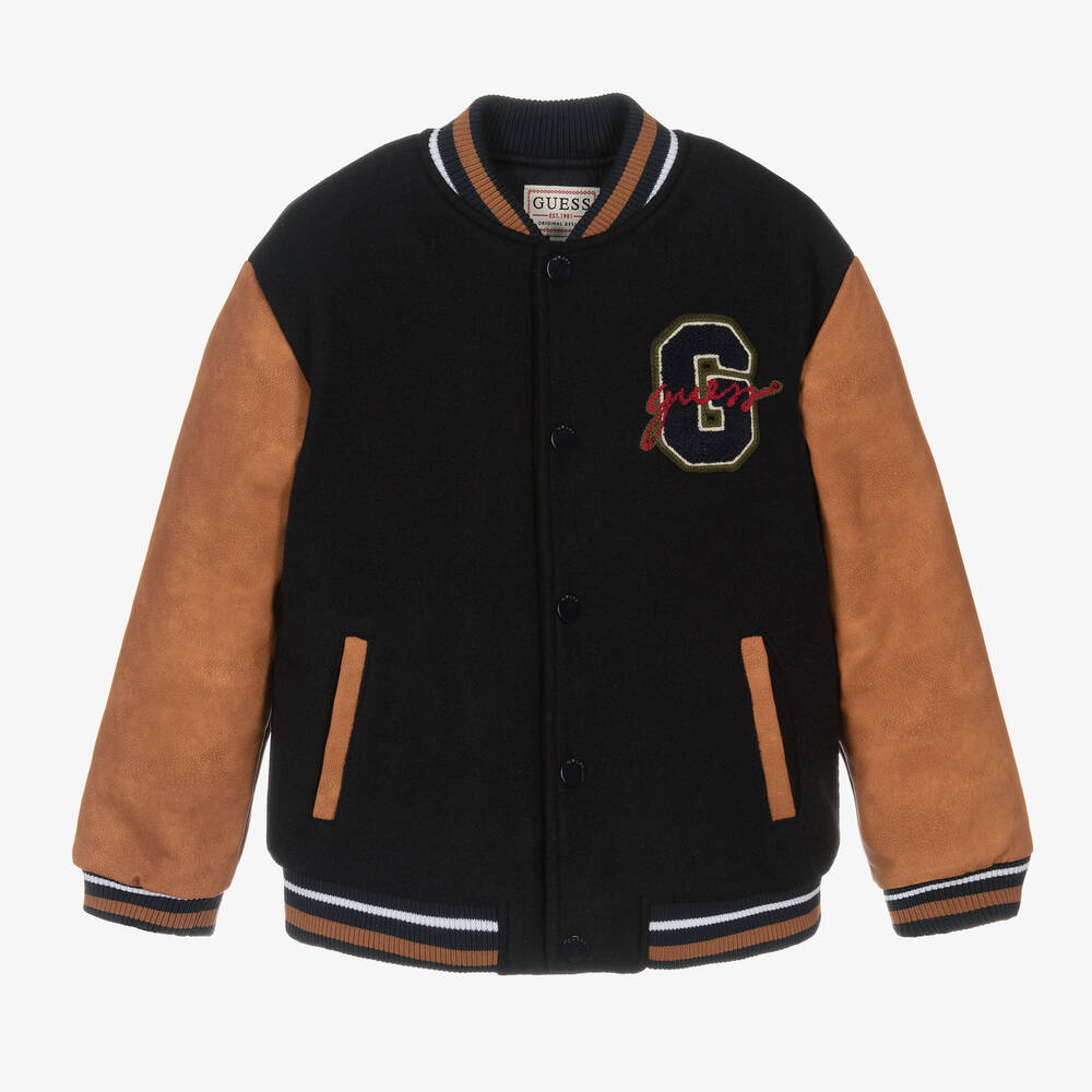 Navy blue bomber jacket for junior boys by Guess, with a soft, felted feel and contrasting tan brown faux leather sleeves. It is designed in a cool varsity style with a branded patch on the chest and a large, teddy bear bouclé appliqué on the back, detailed with red and gold logo embroidery. Lightly padded for warmth, it has a soft cotton jersey lining and useful front pockets. Classic striped trims and branded popper fastenings complete the cool look.