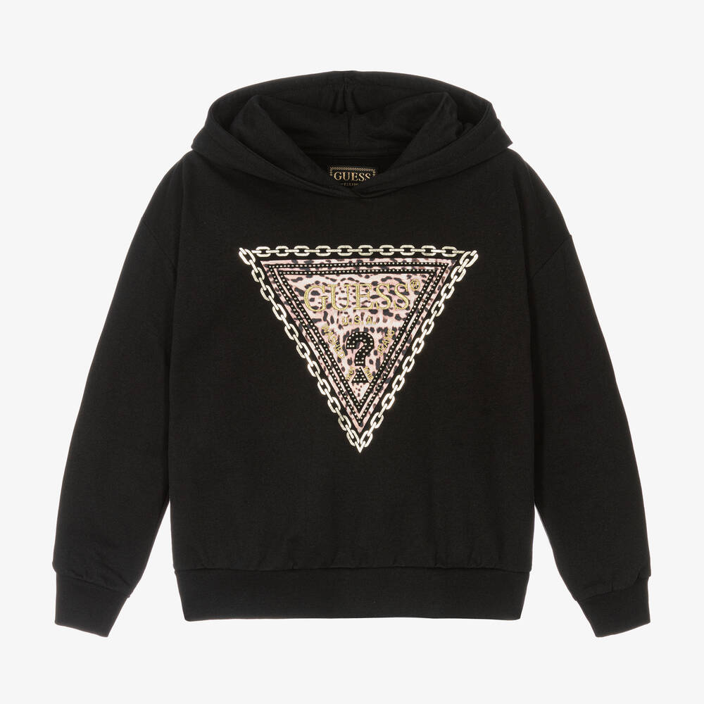 A casual, black hoodie for junior girls by Guess, made in mid-weight cotton jersey, with a soft, fleecy feel inside. The American brand's distinctive Triangle logo can be seen on the front, reimagined in a stylish animal print and detailed with sparkling diamantés and gold embroidery. This product contains organic cotton fibres.