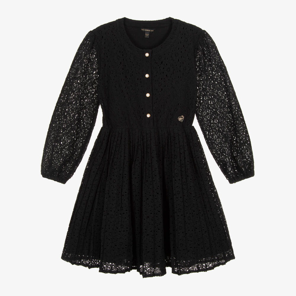 An elegant black floral cotton lace dress for junior girls by Guess, lovely for a party or a smart occasion. Simply beautiful, it has a pleated skirt, a classic round neckline and semi-sheer puffed sleeves. Lovely pearlescent golden buttons fasten half-way down the front and it has a soft cotton jersey lining for comfort and modesty. A heart logo charm adds a designer finishing touch.