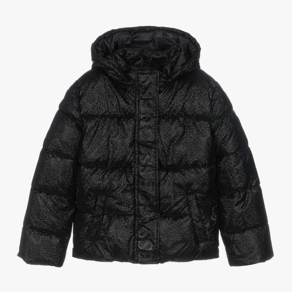Black puffer jacket for junior girls by Guess, made in silky soft fabric with a shimmery sparkle. It has a cosy fixed hood and is softly padded for comfort and warmth. The front zip fastening is covered by a popper fastening flap which features a rubberised repeat logo for brand recognition. To help keep hands warm, the jacket has useful pockets on the front.