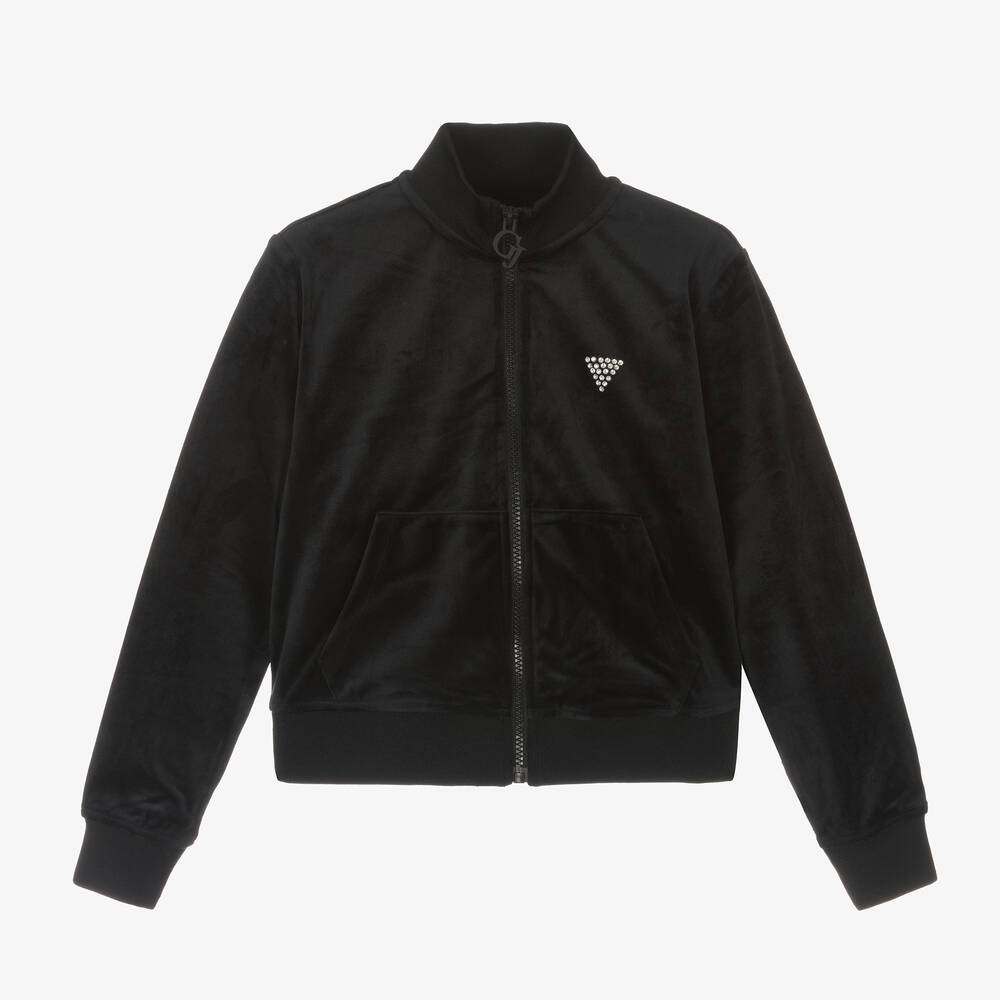 From Guess for junior girls, a super soft black velour zip-up top. This long-sleeved top is ideal as an extra layer on cooler days, with stretchy cuffs and front pouch pockets for warming hands in. The brand's signature Triangle logo is on the chest in silver rhinestones for added sparkle and the zip fastening has a tonal initial pull for a designer finish.
