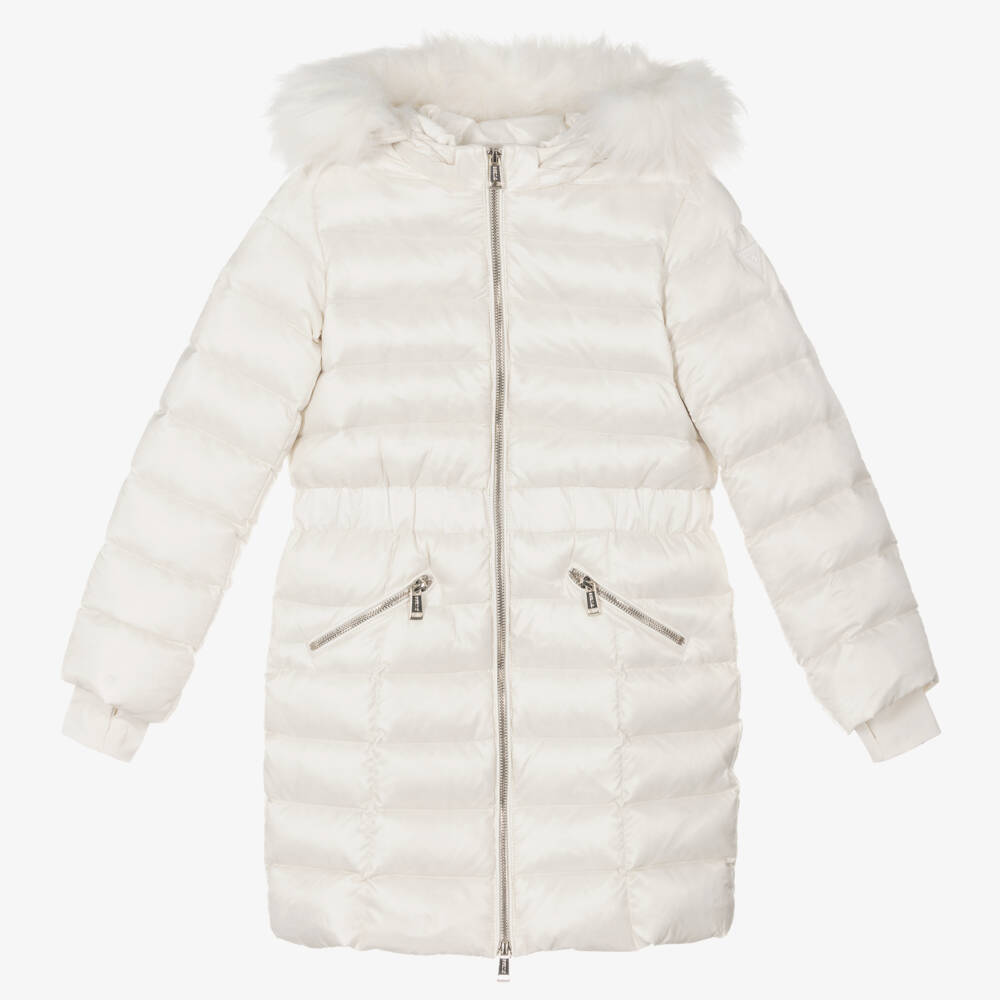 Ivory hooded puffer coat for junior girls by American brand Guess, made in a silky smooth fabric, with a gorgeous sheen. Warmly padded with luxurious down, it has a silky lining, inner jersey cuffs with thumb holes and a popper-fastening snow skirt for extra protection. For a feminine shape, the waistband is elasticated and it fastens with a two-way zip on the front. There are zipped pockets and both the removable hood and faux fur trim have a zip fastening. The brand's Triangle logo patch is on one arm for a discreet designer finish.
