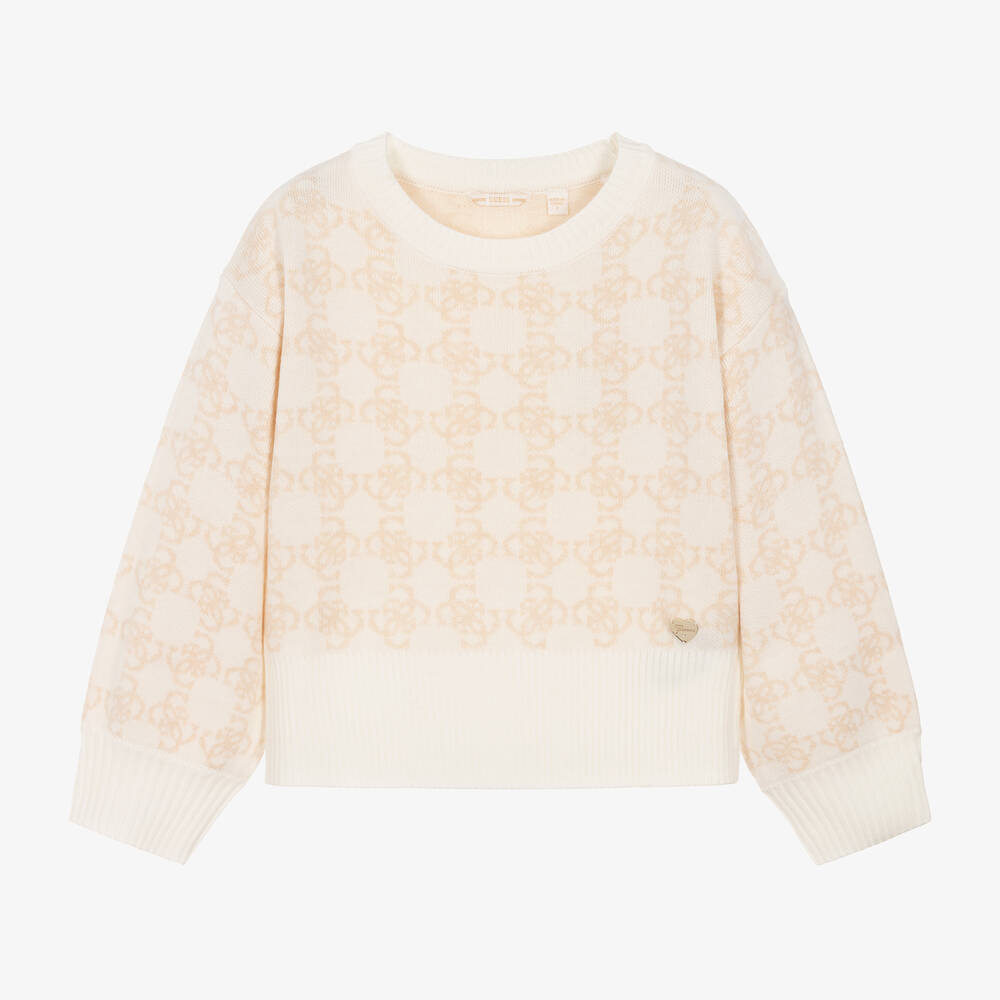 Ivory sweater for junior girls by Guess, knitted in a soft fabric blend with a touch of wool. This warm layering piece is knitted with a beige 4g jacquard design that is used throughout the Guess collection. A pretty heart charm is stitched on the front, engraved with the designer's name.
