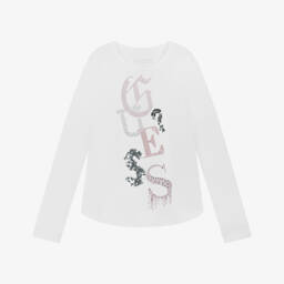 Pink long-sleeved top for junior girls by Guess, made in sustainable viscose jersey. Beautifully soft, this comfortable top has a sparkling sequin and rhinestone logo design on the front for an elevated casual look.