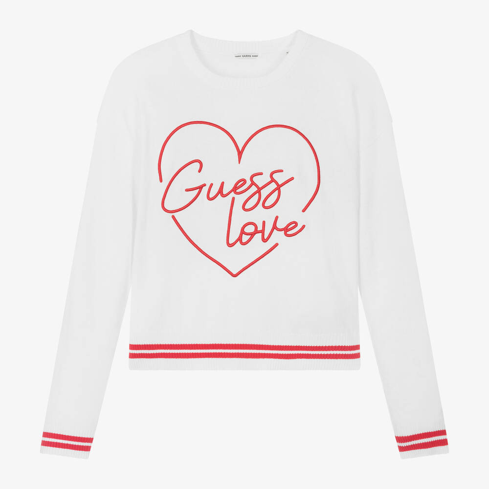 White knitted sweater for junior girls by American brand Guess, with a large, red heart and 'Guess Love' logo embroidered on the front. Super soft and lightweight, it is made in a cotton and viscose blend with a touch of cashmere, long sleeves and neat, ribbed trims striped in red. It has an oversized fit, just right for casual days.