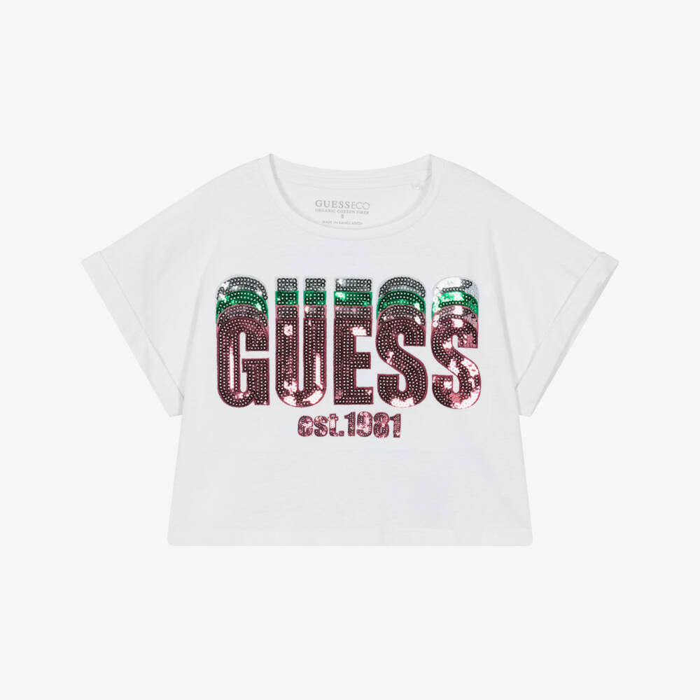 Junior girls white cotton T-shirt by Guess, designed in a stylish boxy fit. This soft jersey top features a shimmery silver, green and pink sequinned logo on the front for instant designer appeal.