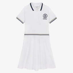 Classic navy blue polo dress for older girls by Guess, made in soft, comfortable cotton piqué. This casual style has white, navy blue and beige tipping on the ribbed trims and a large embroidered 4g logo on the chest, sparkling with diamantés, for instant brand appeal. It fastens with branded buttons on the front and has a flippy flared skirt.