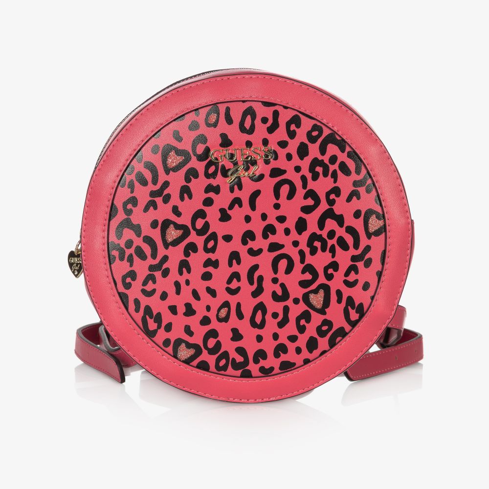 Pink animal print mini backpack for girls by Guess. Made with soft faux leather, this cute bag has a leopard print pattern in black with glittering pink accents, and a gold metal logo. It has a silky satin lining, zip fastening with a heart-shaped logo charm, and adjustable metal chain and faux leather shoulder straps.