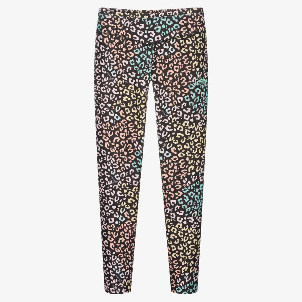 Make an activewear statement with these sporty black leggings for teen girls by Guess, with a fun leopard print design, and a logo appliqué on one leg. Made in stretchy lycra, they are ideal for exercise or even just lounging around the house.