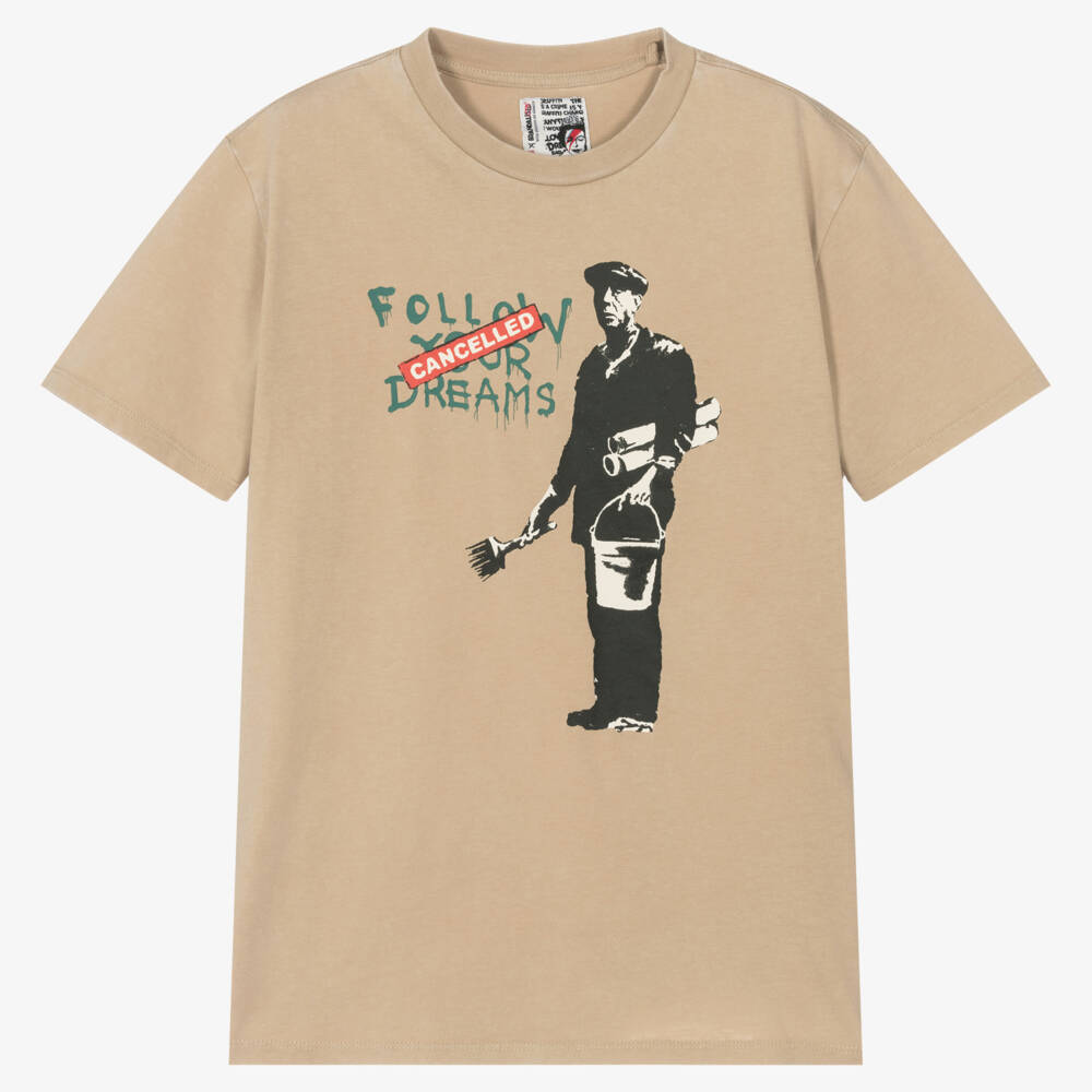 Oversized beige cotton T-shirt for teen boys by Guess, forming part of the designer's Brandalised capsule. Designed by iconic British street artist, Banksy, the artwork on the front has an edgy 'Follow your Dreams' slogan with 'CANCELLED' written across the front.