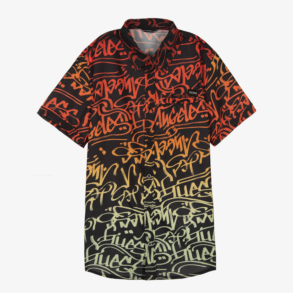 Cool black shirt for teen boys by American brand Guess, patterned with graffiti-style logos in red, orange, yellow and green. Endlessly comfortable for relaxed days, it is loose-fitting and made in silky soft, lightweight twill. There is a logo tab above the useful chest pocket and logo-embossed button fastenings on the front.
