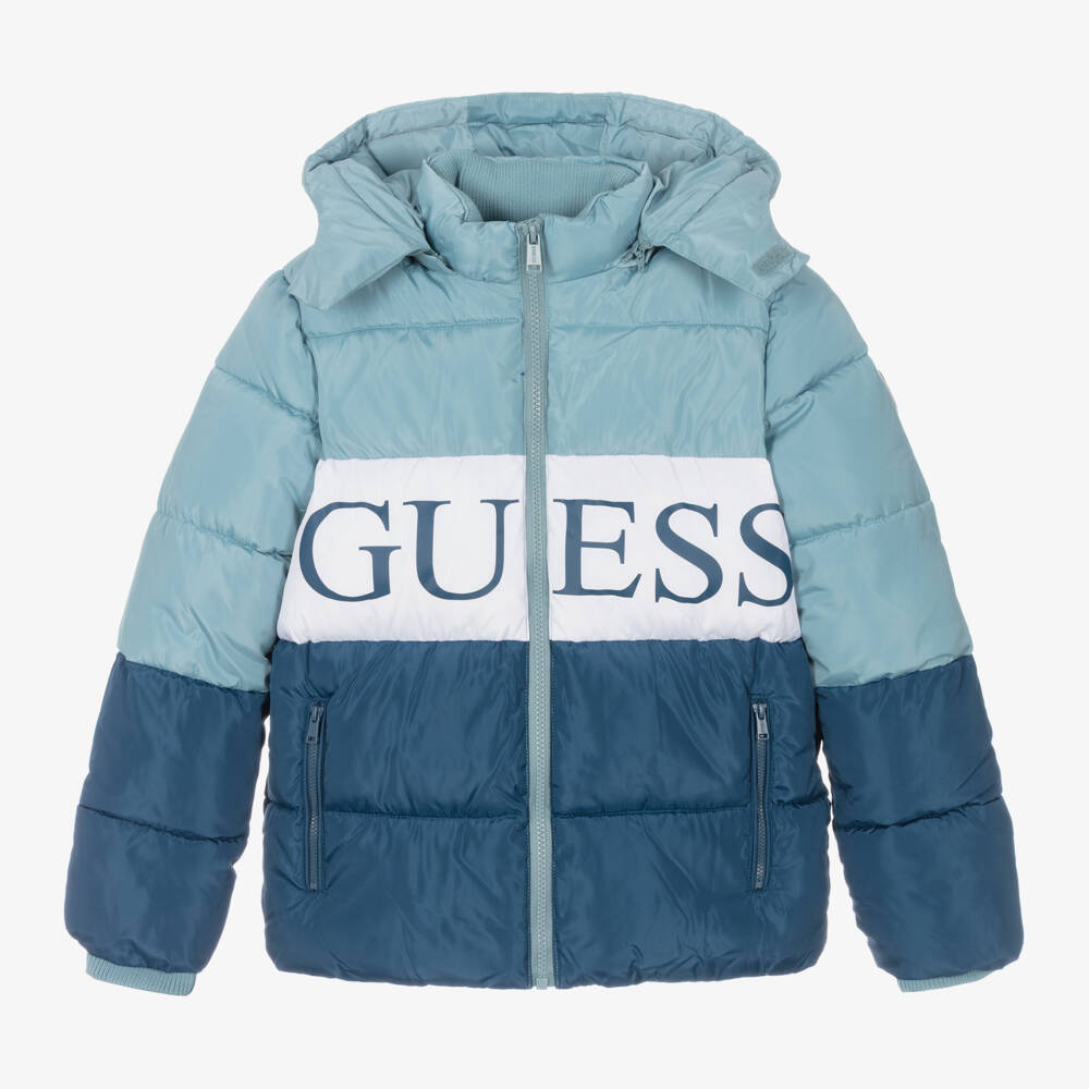Unmistakably designer, this blue colourblock puffer jacket for teen boys by Guess, has the brand's name boldly printed across the chest. Warmly padded, it has stretchy ribbed cuffs and a large hood, that can be detached for alternative styling. It has zipped pockets and a branded zip fastening on the front, with the brand's signature Triangle logo badge on one sleeve, for extra designer appeal.
