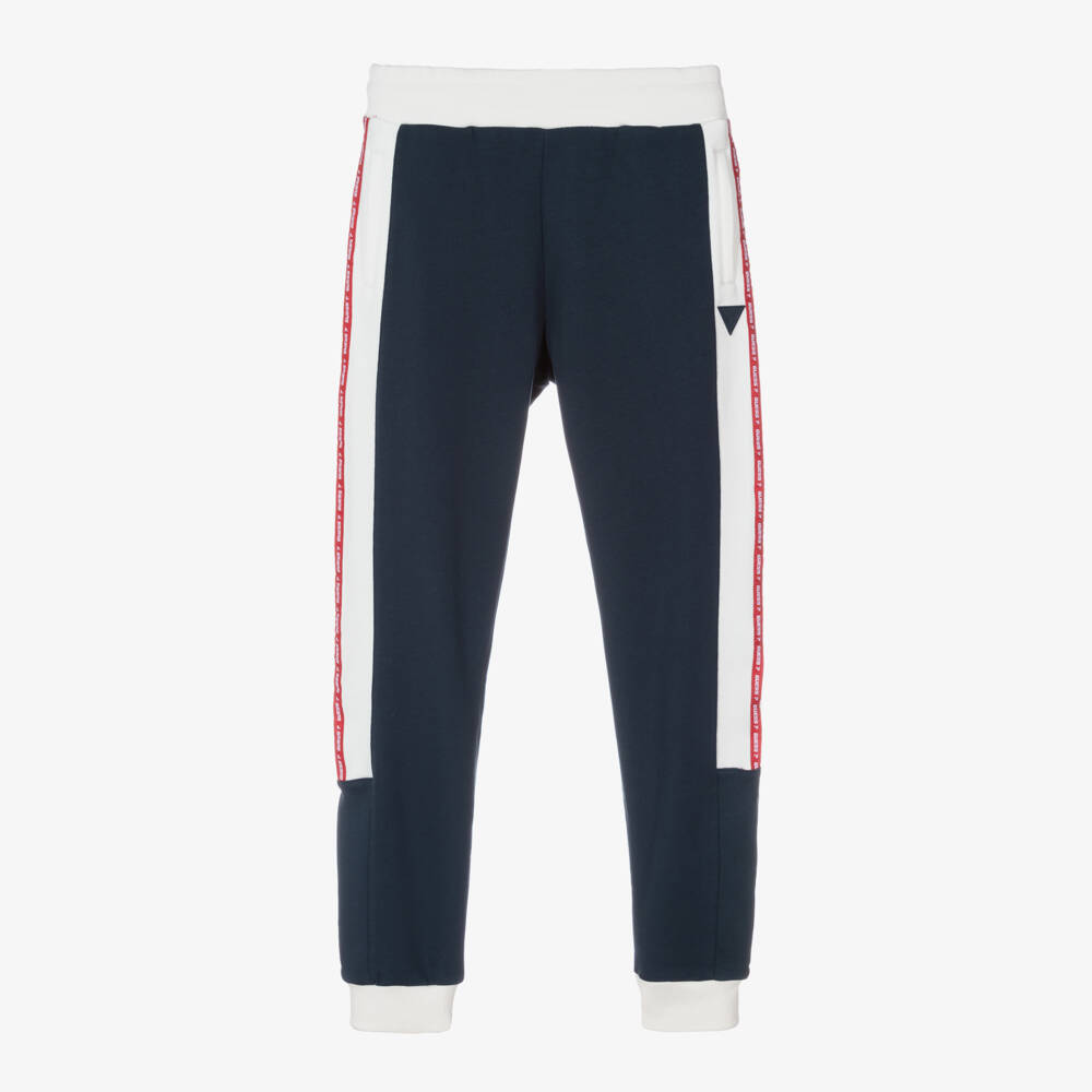 Cool navy blue and white joggers for teen boys by American brand Guess, inspired by the menswear collection. The red and white logo ribbon trims on both legs and a rubberised blue triangle logo patch are added for instant recognition. There are two pockets on the front and one on the back, all with concealed zips for added security. So comfortable in a soft cotton sweatshirt jersey, they have ribbed ankle cuffs and an inner drawstring on the elasticated waist.
