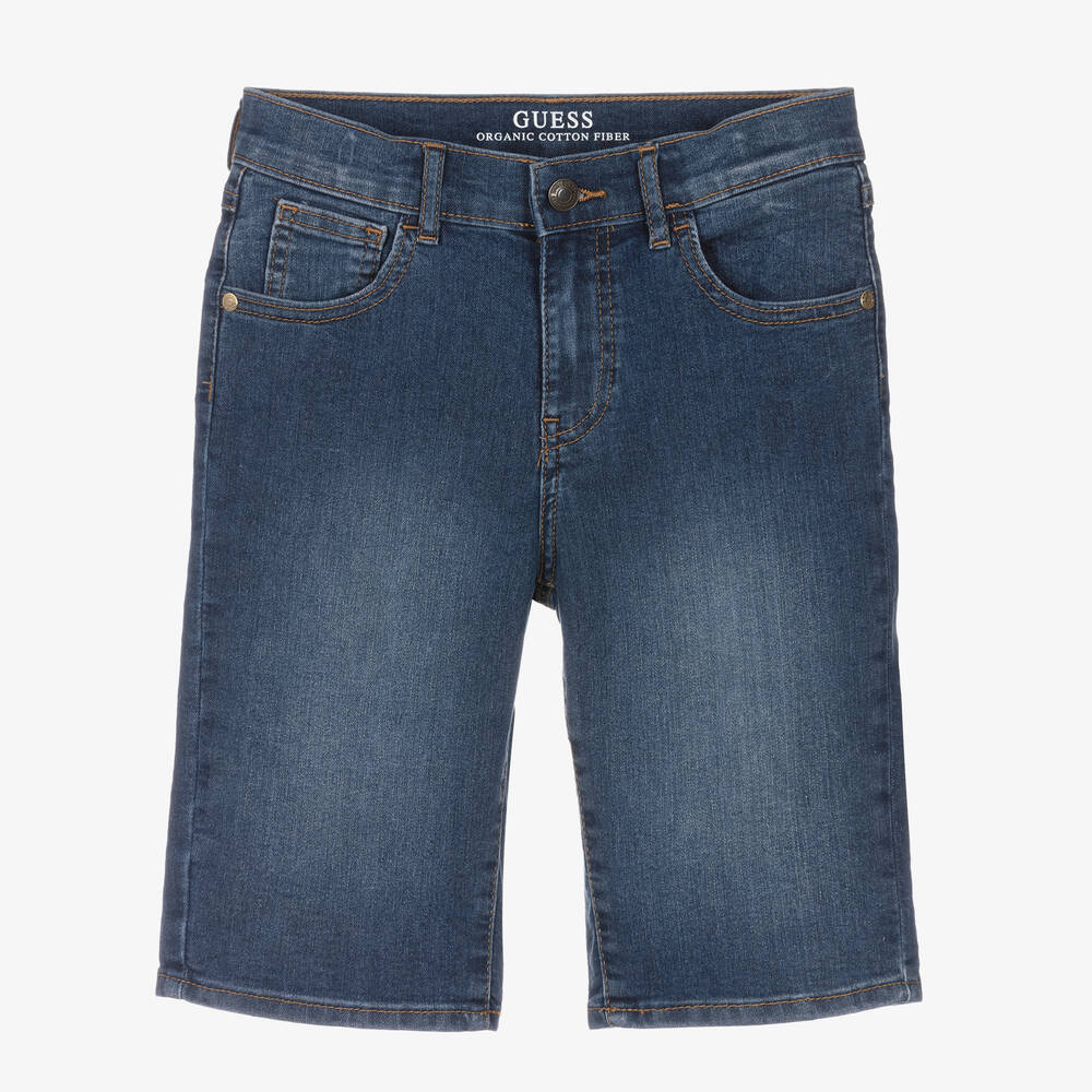 Teen boys dark blue denim shorts by Guess, made in soft cotton denim with a little stretch. The back pocket is trimmed with a logo patch of the brand's iconic Triangle for an instantly recognisable logo look. Fastening with a branded button and zip for added branded detailing, they have stylish contrast stitching. This item contains organic cotton fibres.