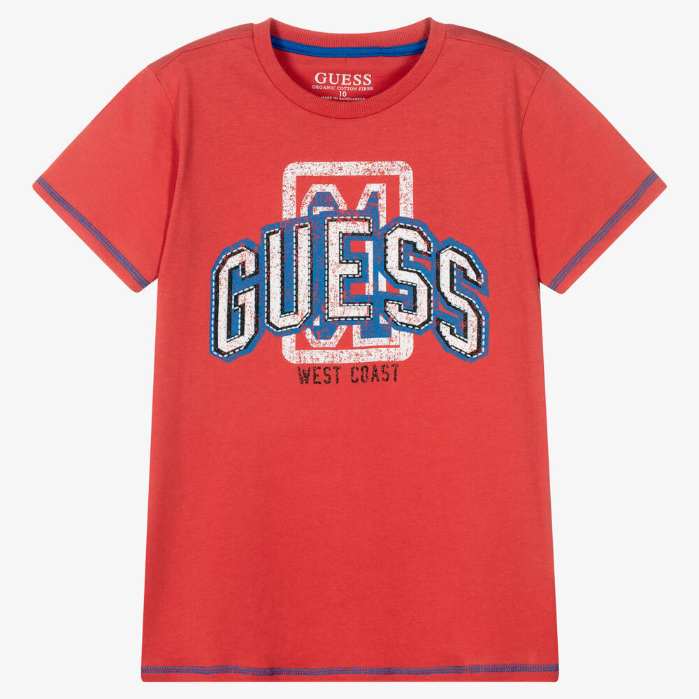Teen boys red T-shirt from Guess, with a vintage-style varsity logo on the front in an edgy distressed effect. Made in soft and stretchy cotton jersey, it has a crew neckline and exposed blue stitching to finish off this cool piece.