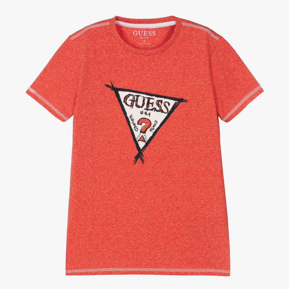 Pale red slub T-shirt for teen boys from American Guess, made in stretchy cotton blend jersey. The designer's iconic white Triangle logo print is on front, in an updated style with edgy black embroidery. This top is detailed with contrast white stitching for a cool effect.