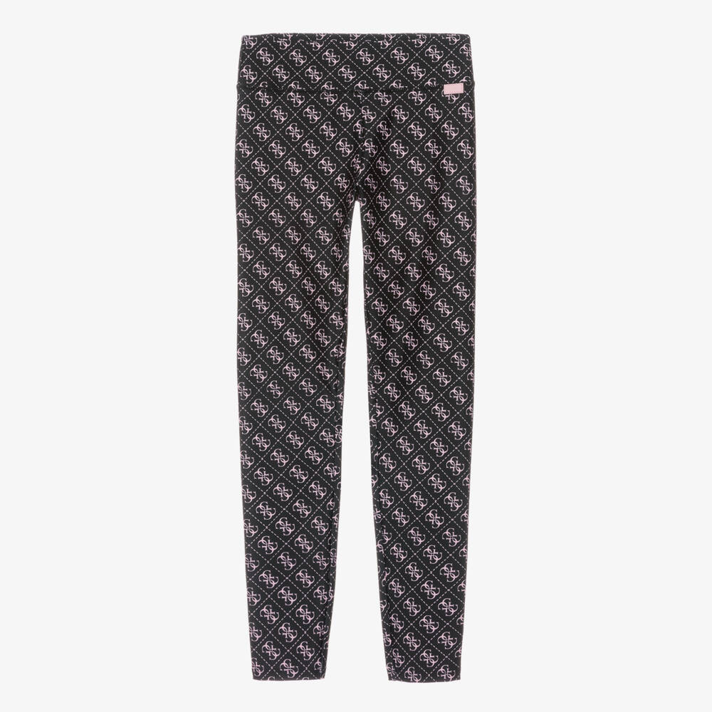 Full-length black leggings for teen girls by Guess, ideal for both active and relaxed wear. Patterned in the brand's 4g logo in pink, they are made in a super stretchy, silky fabric with a comfortable elasticated waistband. To complete the stylish designer look, a small rubberised logo patch is stitched on the front.