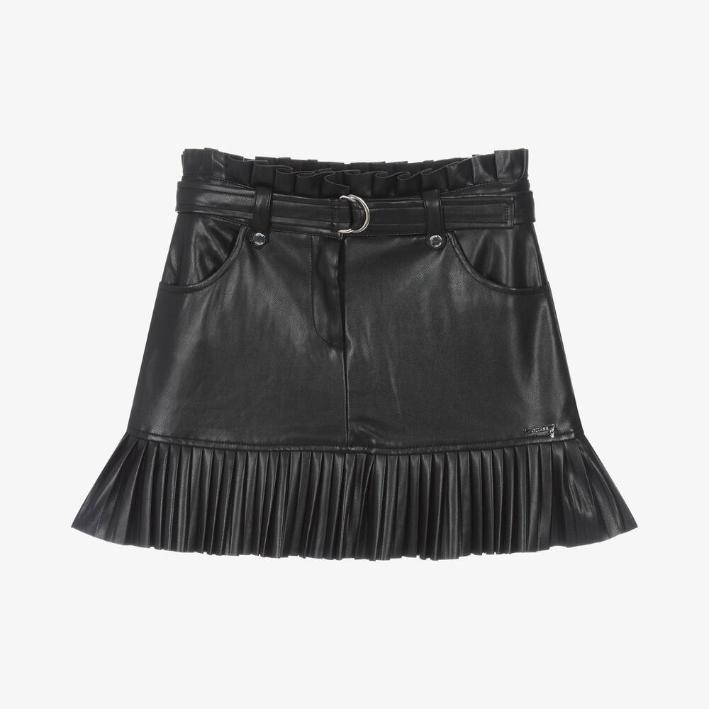 Stylish black skirt for teen girls by Guess, made in smooth faux leather. Trimmed with statement pleats and a silver metal logo plate, this cool urban design is soft, stretchy and comfortable. It is styled with handy front pockets, branded silver rivets, and an easy-to-fasten front popper and zip. It comes with a removable D-ring belt for a flattering fit and edgy look.