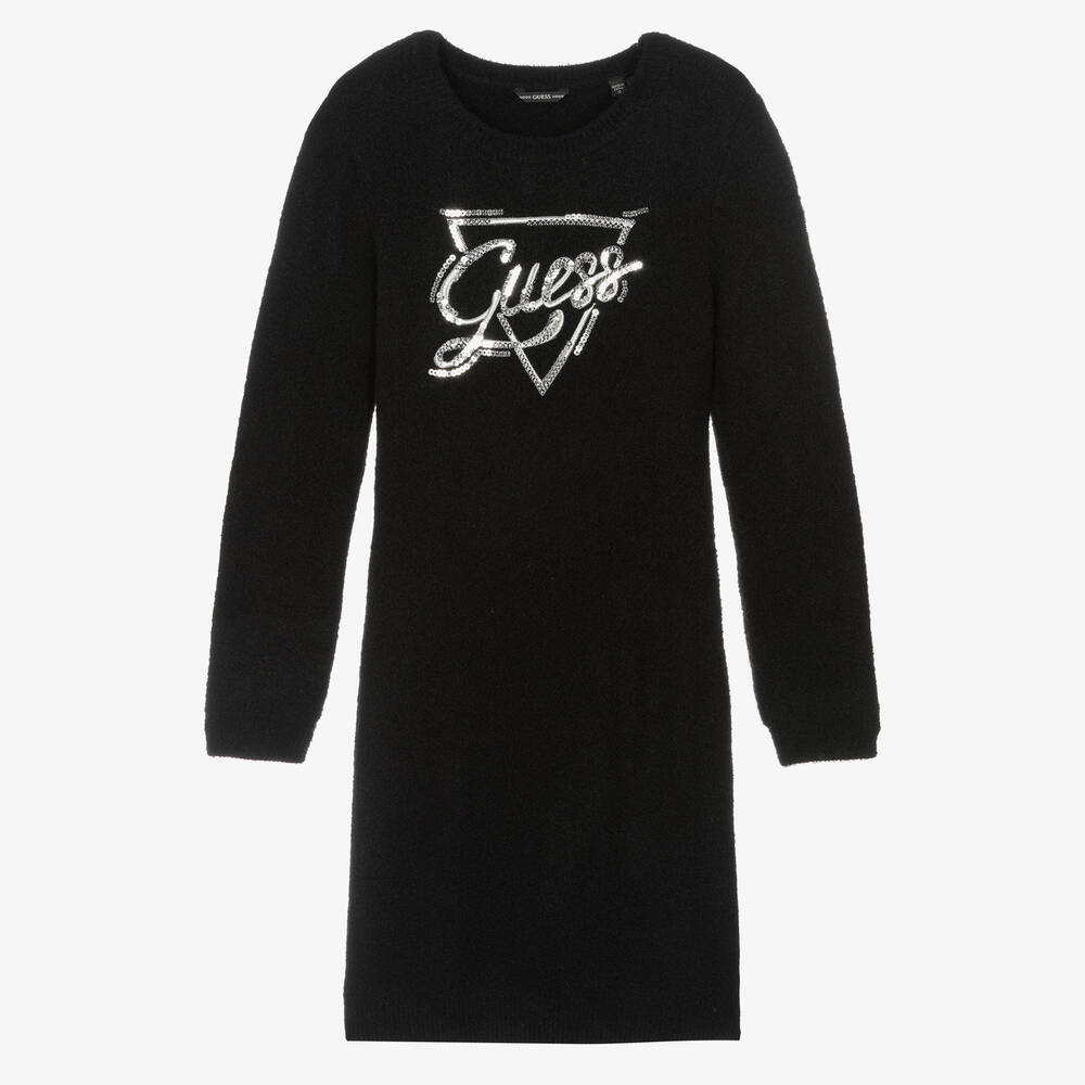 Black sweater dress for teen girls by American brand Guess, with a metallic silver Triangle logo on the front with hand-beaded sequins for extra designer impact. This casual dress has a round neck and stretchy ribbed trims for a comfortable fit.