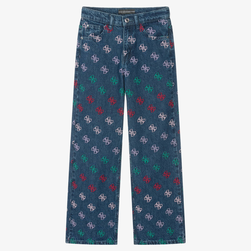 Blue cotton denim jeans for teen girls by Guess, embroidered with the iconic pastel 4g logo. Lovely for streetwear styling, these cool wide-leg jeans have a five-pocket design with the signature Triangle logo on the back. They have a zip and branded button fastening, with an adjustable waist for shape.