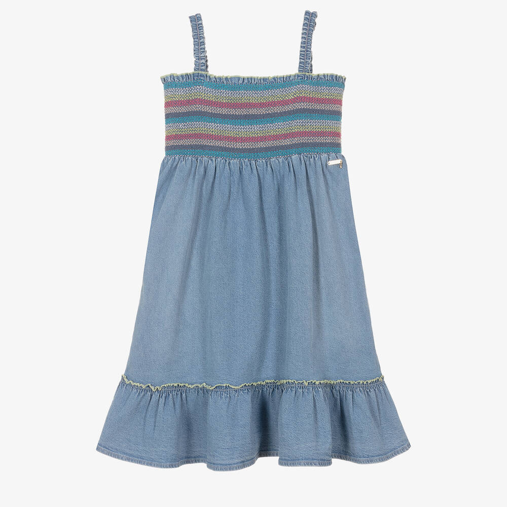 Stylish and casual for warmer days, this washed blue denim sundress for teen girls is from American brand, Guess. Comfortable and easy-to-wear, it is made in breathable cotton with elasticated shoulder straps and a shirred bodice with colourful striped elastic. The gathered skirt has a pretty ruffle hem and the look is complete with the designer's gold metal logo on the waist.