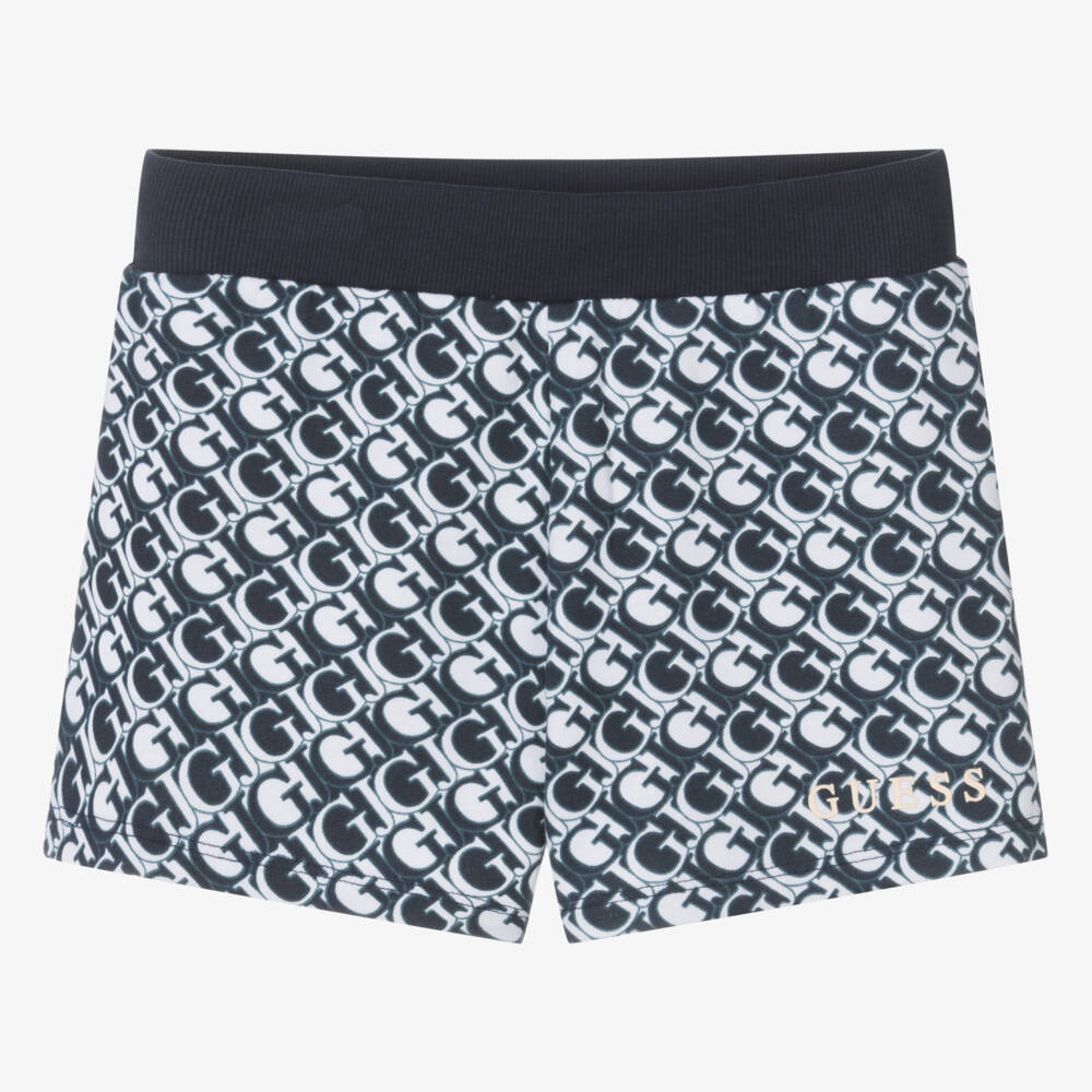 Patterned in a distinctive monogram logo design, these navy blue and white cotton shorts for teen girls are by American brand Guess. They are made in soft sweatshirt jersey, with the designer's name printed in ivory on one side. Super comfortable to wear, they have an elasticated ribbed waistband.