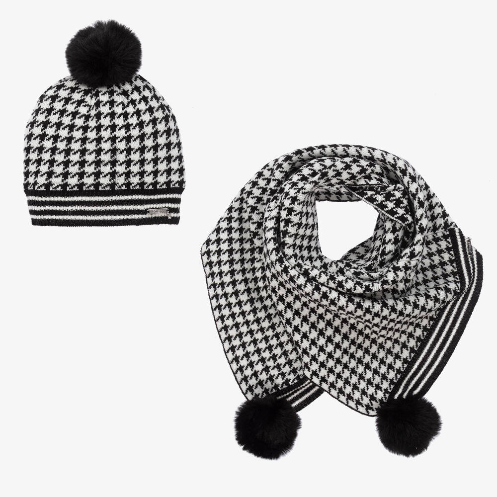 Stylish black and white houndstooth check hat and poncho by Guess. This two-piece gift set for teen girls is softly knitted for warmth. The poncho pulls on over-the-head and sits over the shoulders. Both pieces have black faux fur pom-pom decorations and a silver logo plate on the front.